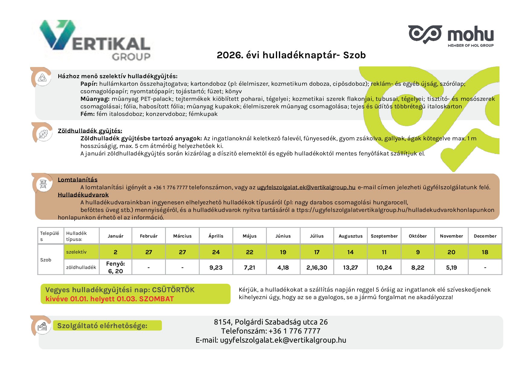 (A 2026. január 1-jére (csütörtöki napra) esedékes hulladékgyűjtés a munkaszüneti napra tekintettel 2026. január 3-án (szombaton) kerül elvégzésre.)